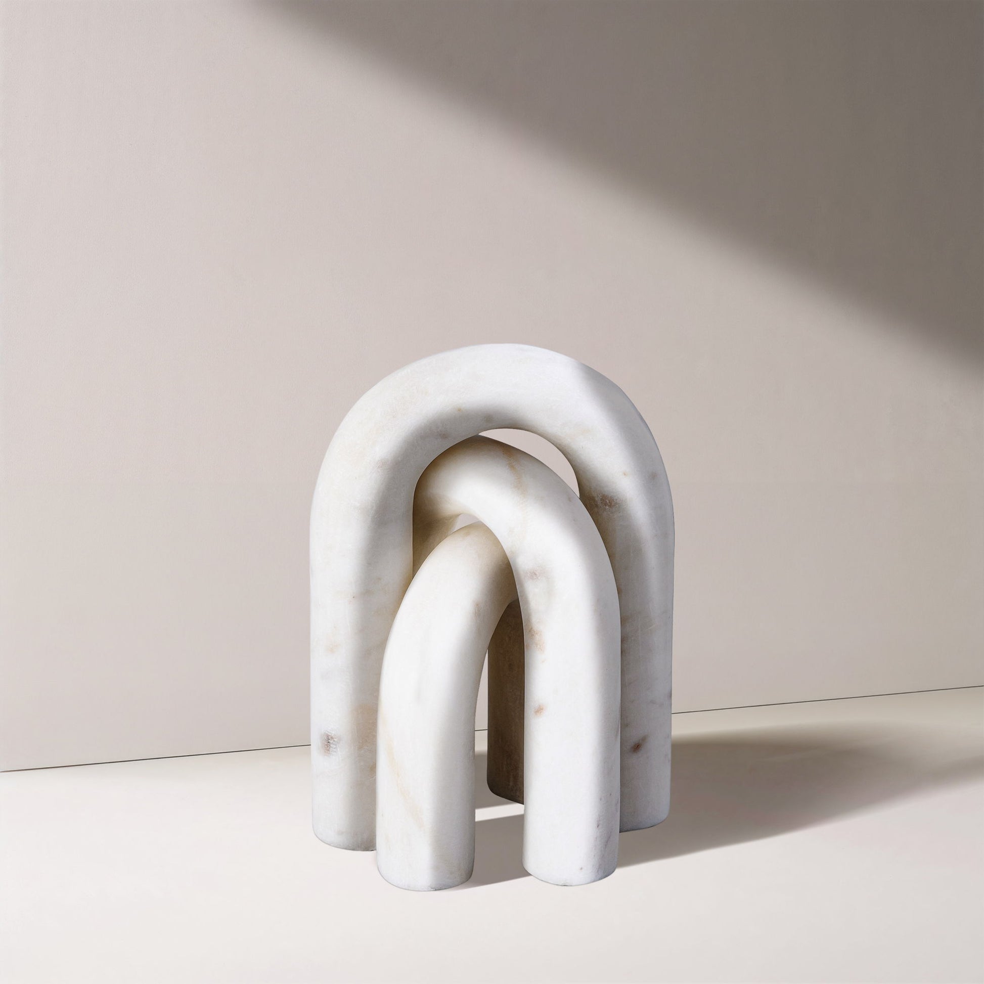 Smooth curves meet in the Arco decorative object, carved from genuine Capri beige marble. No two sets are alike-each one shaped by earthy veining and subtle tonal shifts for a truly one-of-a-kind accent.