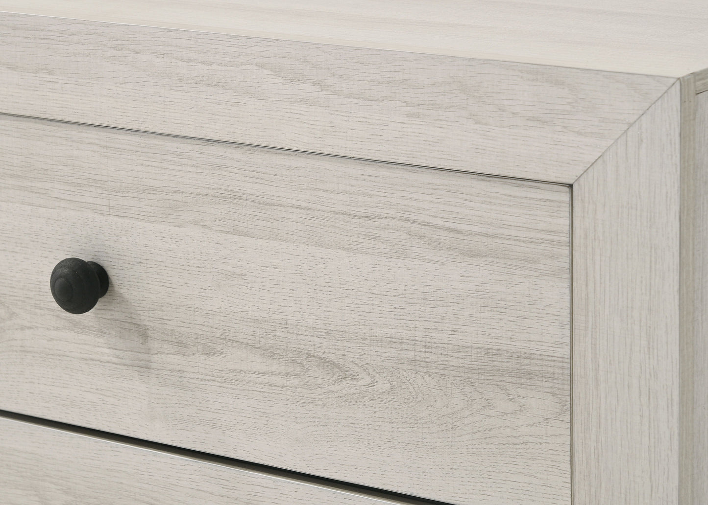 This bedroom collection embodies a rustic, yet minimalist aesthetic with its clean lines and neutral color palette. The set includes a low-profile bed frame, a dresser with a mirror, and a tall chest, all finished that easily complements any decor. The sleek metal handles on the drawers add a touch of contemporary flair, while the large mirror reflects light, making the space feel brighter and more open.
