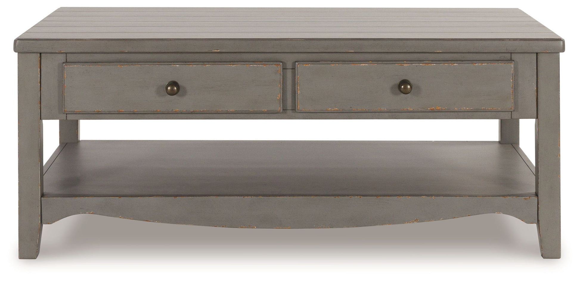 Put your love of European farmhouse styling on display. Finished with an antiqued gray chipped paint effect for an authentic vintage look, this coffee table is loaded with character. Two drawers and an open display shelf allow for storage and easy access to books, beverages and more.