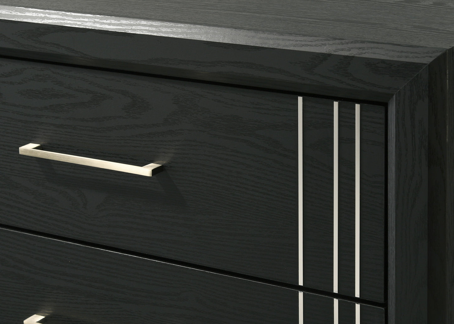 This elegant bedroom collection presents a sophisticated ensemble perfect for creating a refined modern aesthetic in your sleeping quarters. The suite features a sleek, minimalist design with crisp, clean lines and a rich finish that exudes contemporary charm. Anchoring the set is a robust panel bed with a prominent headboard, promising a sturdy and stylish centerpiece. Flanking the bed are complementary case pieces, offering ample storage with their smooth-gliding drawers accented with chic silver-toned hardware.