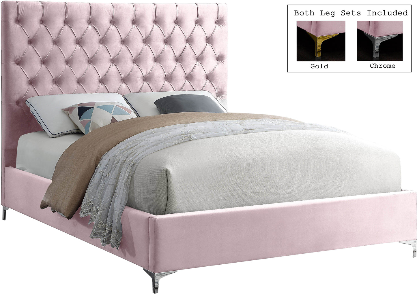 Revamp your bedroom space with this sumptuously crafted Cruz bed from Meridian furniture. The star of the show here is the headboard its tufted with deep button tufts that not only keep its thick padding in place and aloft, but also add a modern, textural look to your space. Sleek velvet upholstery feels luxuriously upscale to the touch, and the high headboard and the minimalist platform frame with metal feet add a timelessly contemporary silhouette to your space.