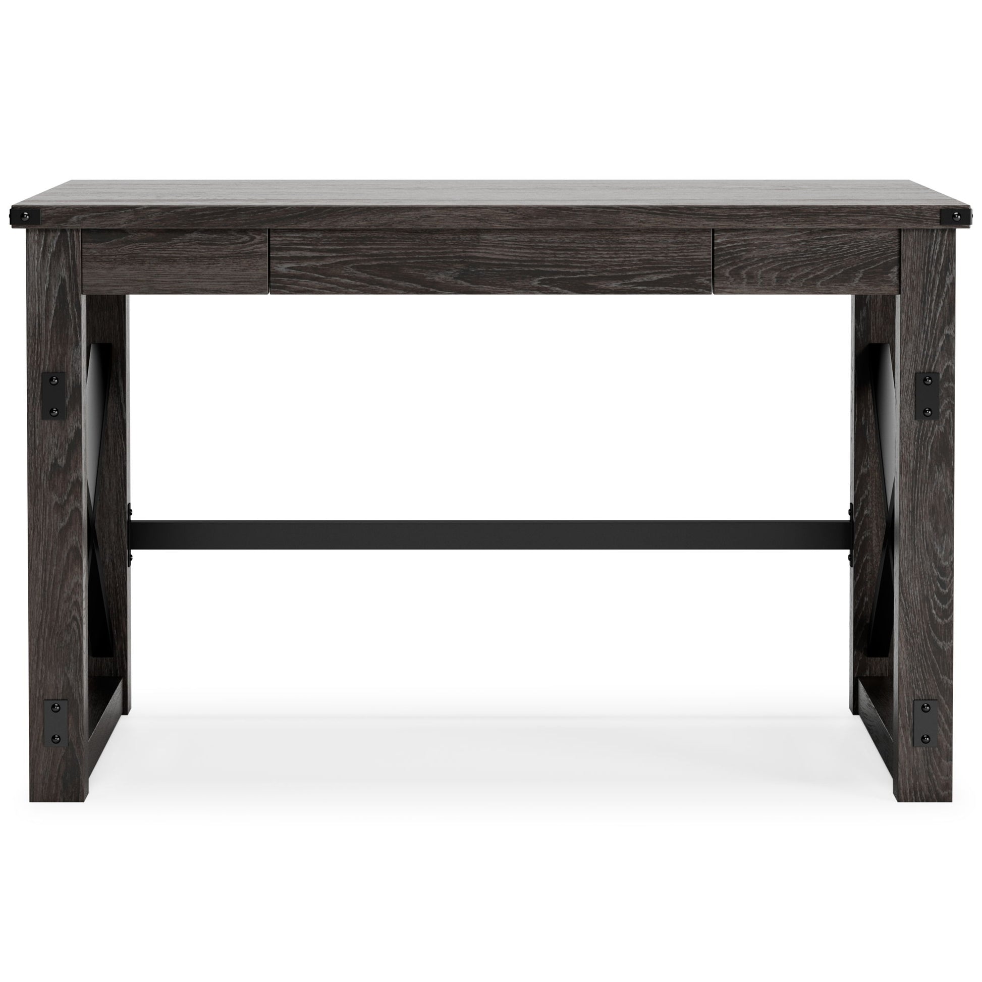 Love an urban farmhouse aesthetic? Make it work to your advantage with this beautifully styled desk. This simply striking choice in home office furniture has an unmistakable farmhouse feel thanks to design elements including a gray decorative wood grain laminate contrasted with crossbuck rails, metal accents and a stretcher in black. Perfect for office supplies, the desk includes a handy center drawer with hardware-less aesthetic to help keep your desk top clutter free