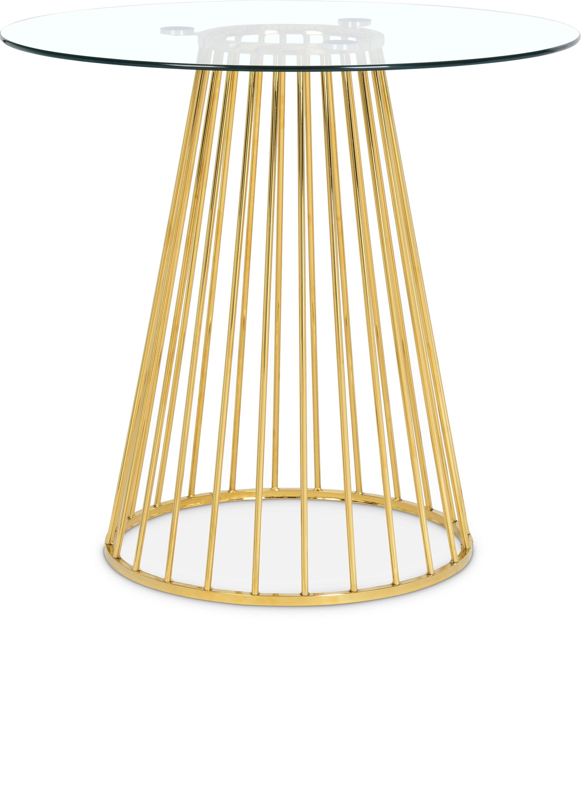 Add a bold touch to your dining area with this chic Gio counter height table. Featuring a round, clear tempered glass tabletop and a polished metal base with a wired contemporary design, this dining table transforms your dining space into a stylish haven.
