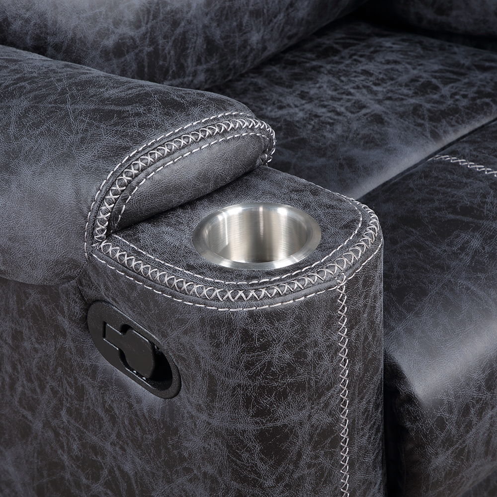 This Hirah motion sofa in dark gray polish microfiber offers both luxury and convenience. Featuring tight back and seat cushions with pocket coil construction and a sturdy wooden inner frame, it ensures maximum comfort. The loveseat includes a console with stainless steel cup holders and a USB port for added functionality. Perfect for relaxing or entertaining, this sofa set combines style and practicality seamlessly.