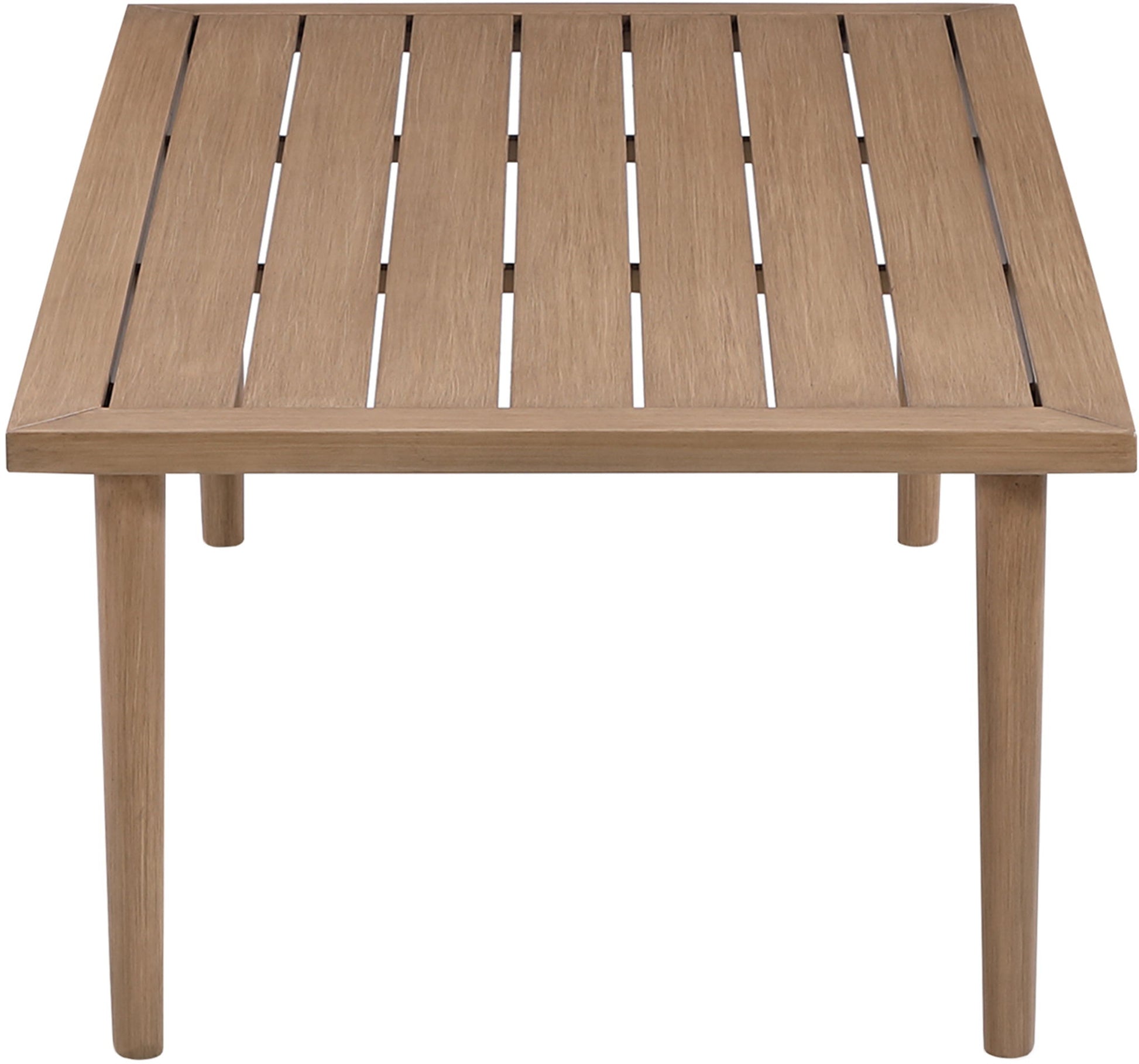 Clean and understated, the Laguna natural teak finish aluminum outdoor patio coffee table offers effortless versatility for any outdoor setting. Its slatted top and slim tapered legs give it a modern, airy feel while ensuring lasting durability. A contemporary essential, it's the perfect foundation for casual gatherings or everyday lounging.