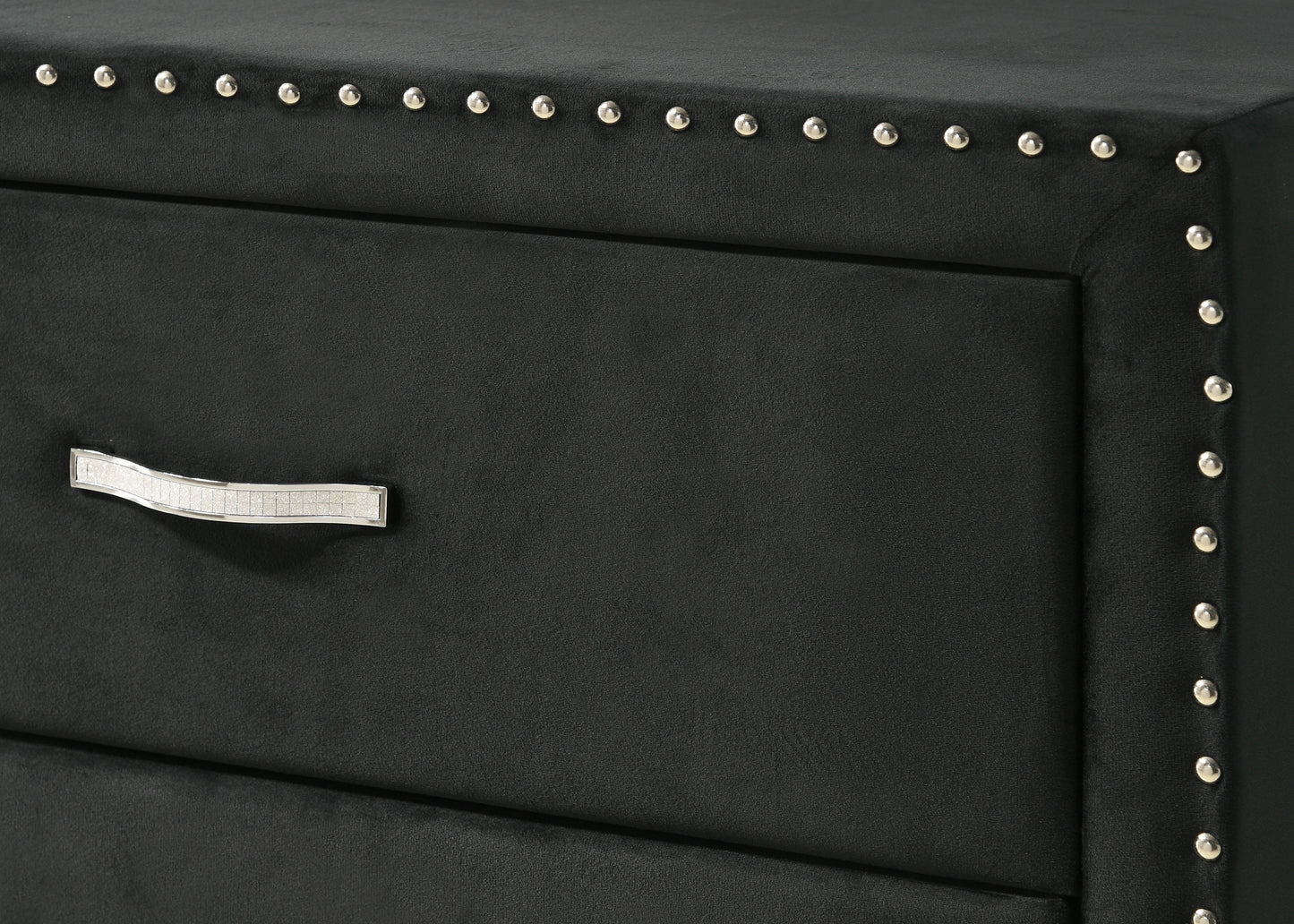 Immerse yourself in the regal charm of this majestic bedroom collection, a true embodiment of luxurious comfort and refined elegance. At the heart lies a bed that commands attention with its impressive wingback headboard, richly upholstered in a rich velvet and adorned with diamond tufting and shining nailhead trim, offering a sophisticated centerpiece. Accompanying the bed are matching pieces, each boasting the same sumptuous fabric and exquisite detailing. The nightstand and chest of drawers stand as stately companions, offering practical storage solutions without compromising on style, their sleek handles gleaming against the dark, plush fabric. The dresser, accompanied by a statement mirror framed with a hint of sparkle, completes the set, creating a harmonious balance between functional design and opulent aesthetics.