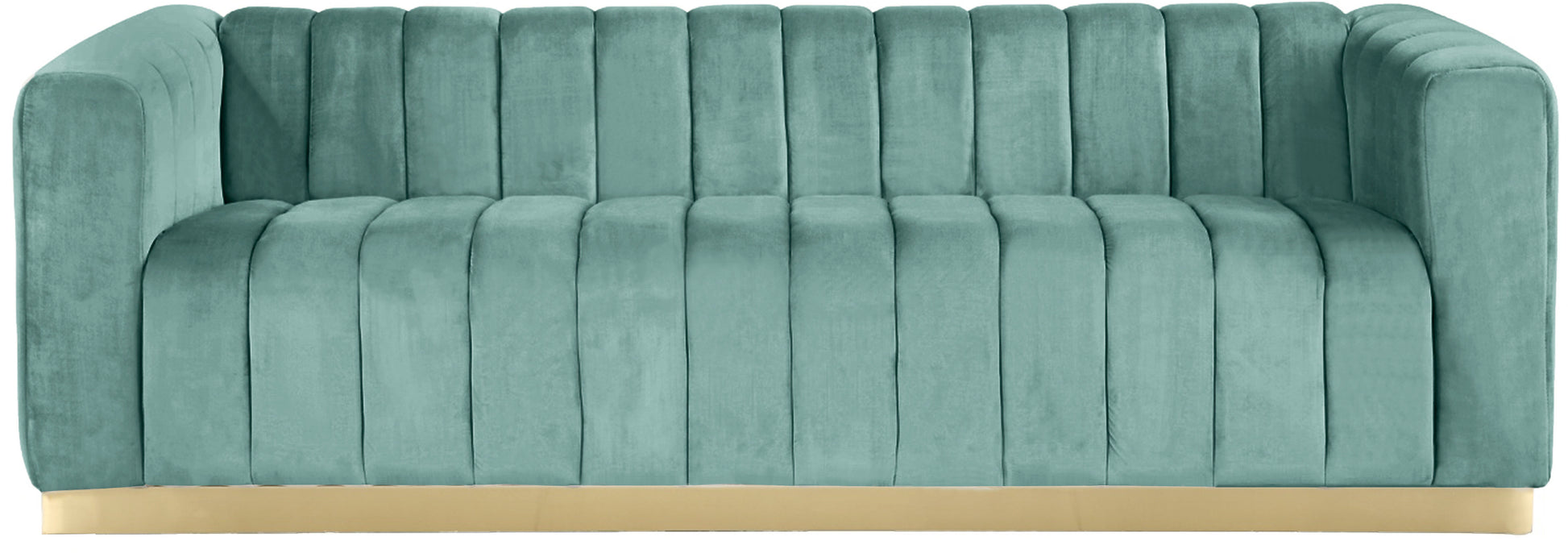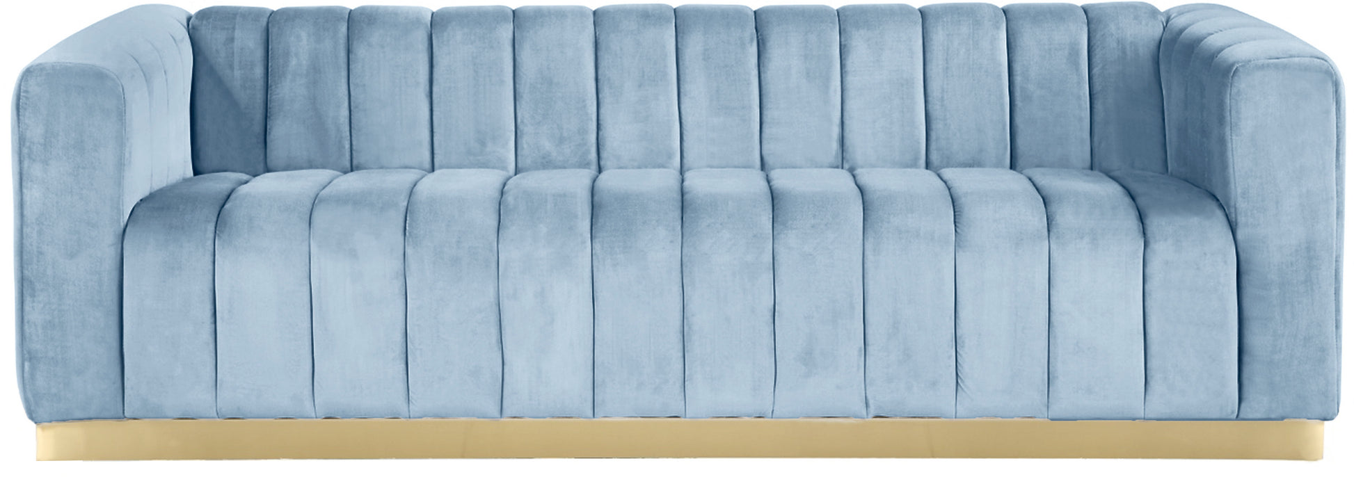 Seat guests in the epitome of comfort and style with this Marlon velvet sofa. This piece is just the thing to showcase your modish style while ensuring total enjoyment from all who are lucky enough to relax on its channel tufted seats. The soft velvet upholstery adds a beautiful touch to your space and feels great against your skin while the brushed gold stainless steel base lends it a contemporary finish.