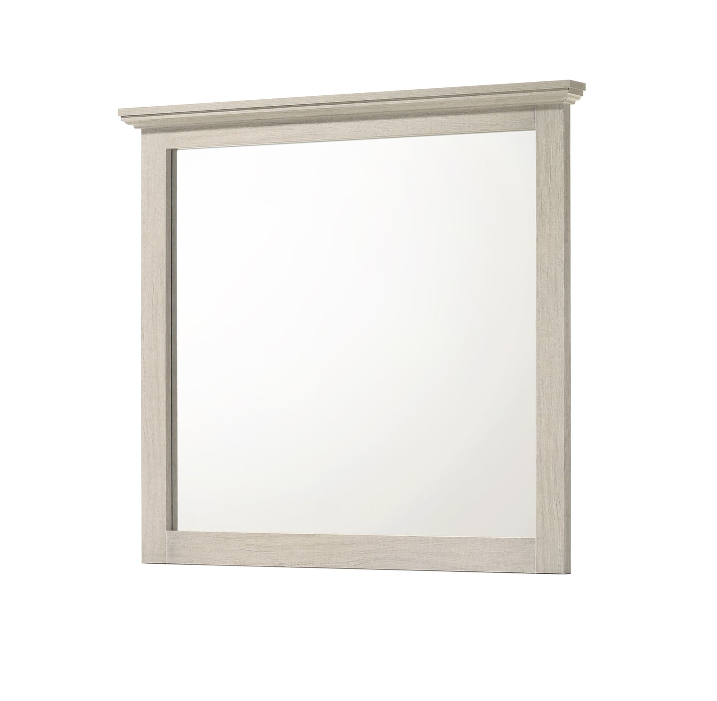 This bedroom collection radiates contemporary charm with its light wood finish and minimalist design. The bed, with its clean lines and louvered headboard, offers a modern twist on a classic design, creating a serene focal point in the room. Complementary pieces include a spacious dresser topped with a large mirror that adds depth and brightness to the space, a tall chest providing ample vertical storage, and a nightstand with convenient bedside access. Each piece is accented with sleek, dark hardware that stands out against the light finish, adding a subtle contrast that is both striking and elegant.
