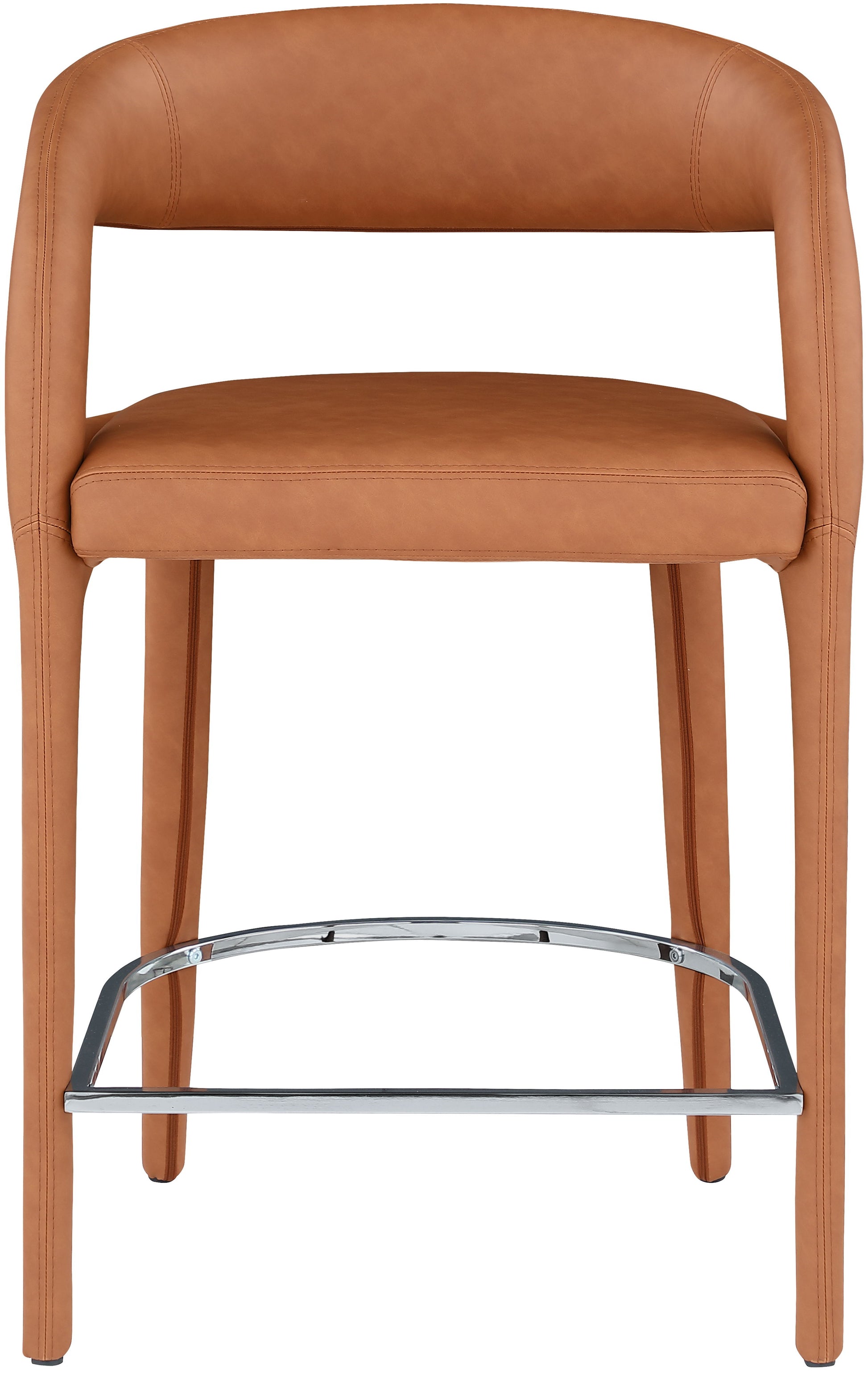 Modernize your home with this Sylvester cognac vegan leather stool. Featuring soft and durable cognac vegan leather upholstery, this stool offers you a comfortable and long-lasting place to sit while you dine. It's fully upholstered, giving it a solid look that is ideal for any contemporary home. Its rounded back provides upper back support, while its semi-open design makes a fashionable decorative statement that is sure to catch the eyes of anyone who joins you for dinner.