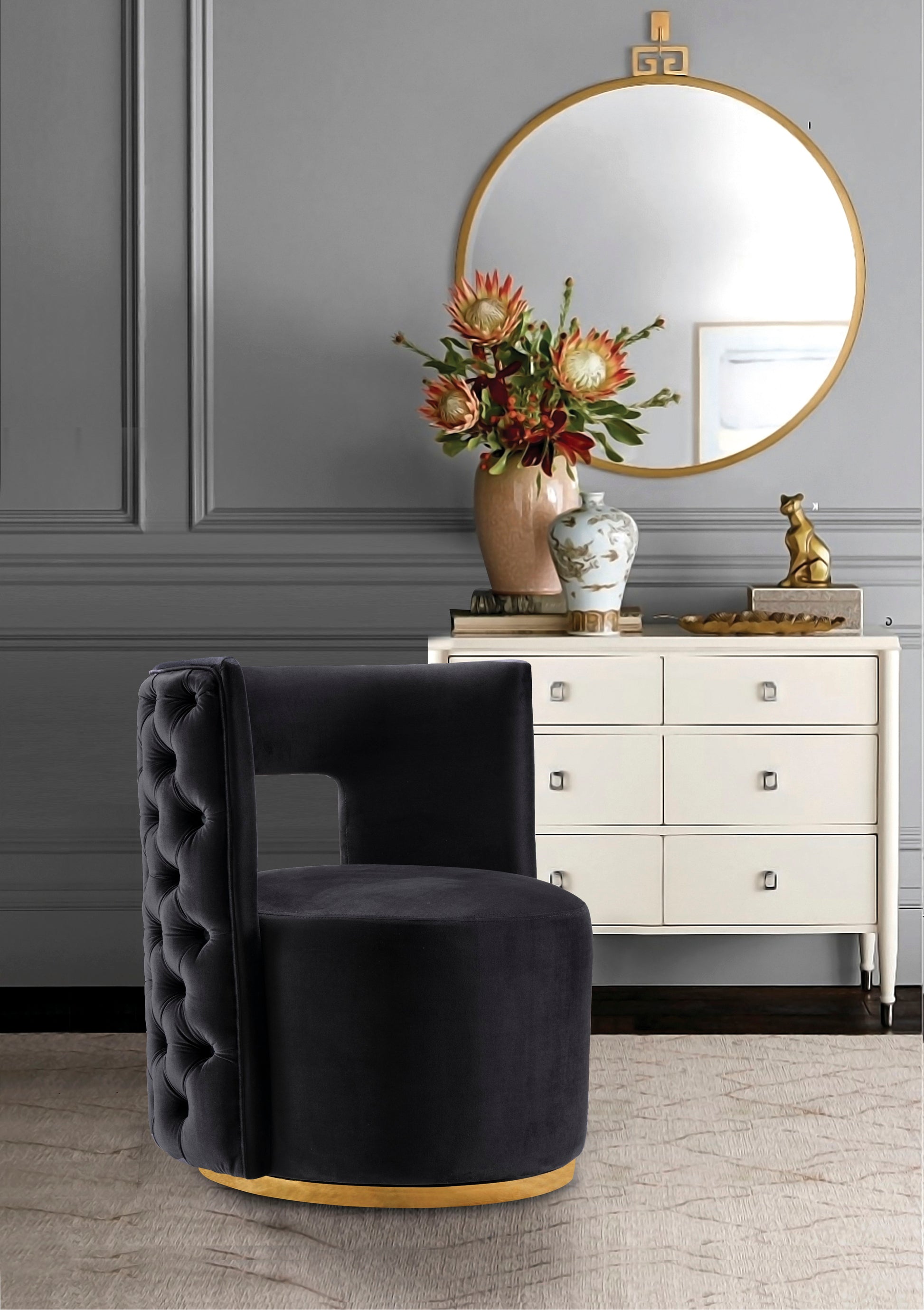 Complement your contemporary decor with this Theo Accent Chair from Meridian Furniture. Featuring a contemporary design with button tufting on the back, this chair is sure to immediately draw the eyes of all who enter your home. velvet upholstery makes this chair luxurious to sit in, and the opening in its back ensures ample air flow while you curl up with your favorite book or in front of the TV. Its swivel base accentuates its velvety dark color, while allowing you to turn whichever way you choose as you recline.