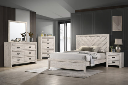 This bedroom collection encapsulates a blend of contemporary design and rustic charm. The centerpiece, a bed with a distinguished chevron patterned headboard, evokes a sense of craftsmanship and texture, infusing the space with character. Flanking the bed are matching pieces, each exhibiting clean lines and a finish that suggests a lived-in elegance. The dresser, complemented by a substantial mirror, along with the tall chest, offer ample storage solutions with understated metal handles that enhance the modern farmhouse aesthetic. A nightstand completes the set, its compact design making it a practical addition to the suite.